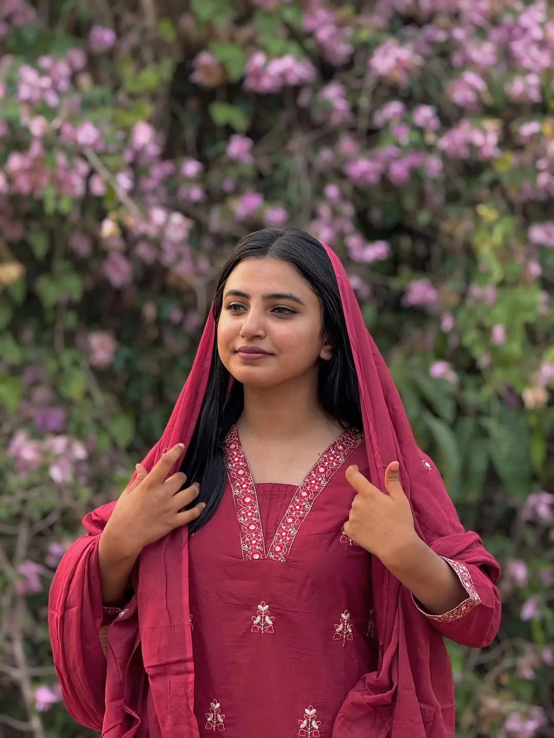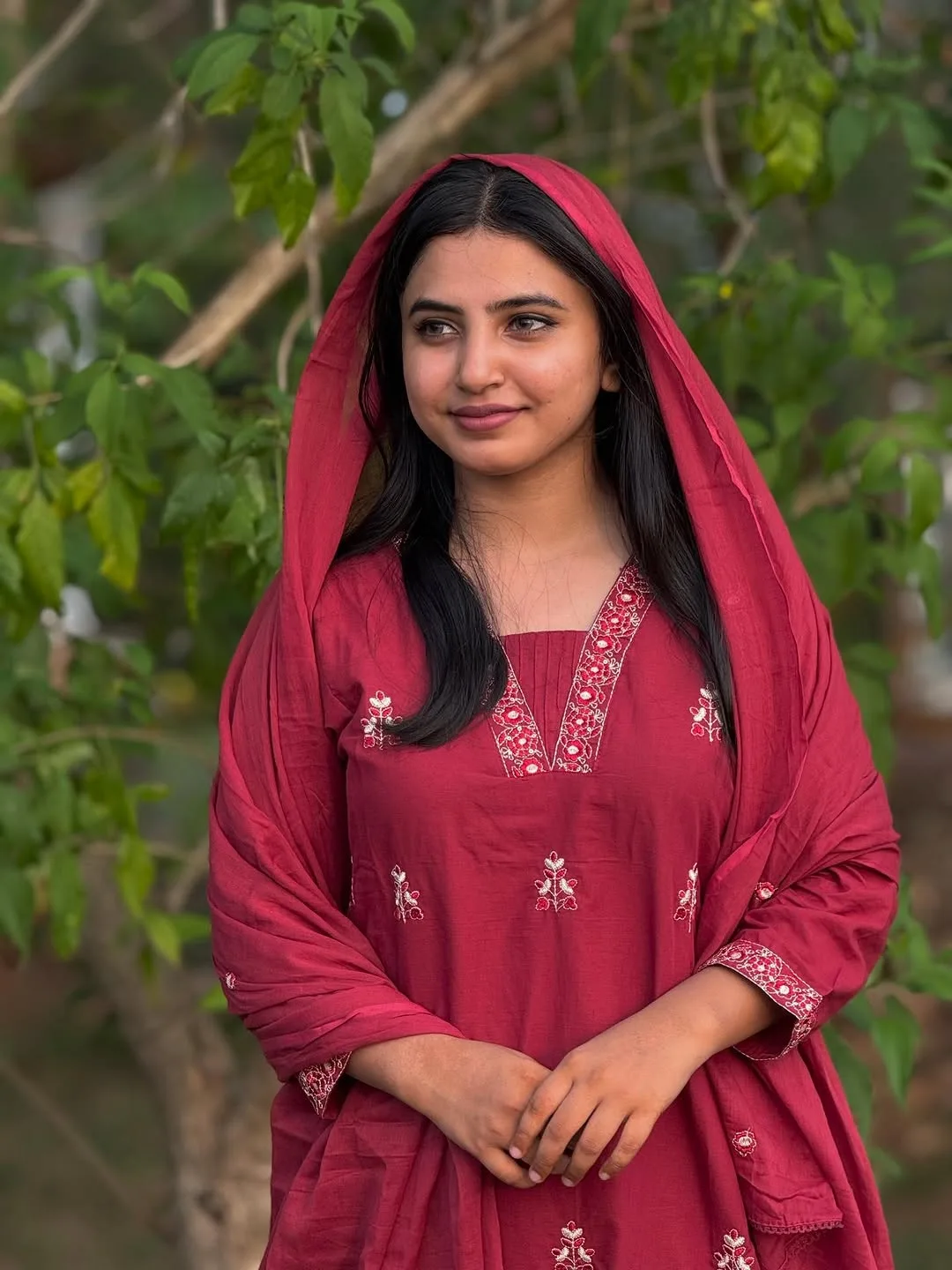 Embrace the perfect harmony of tradition and contemporary grace with our Garnet Petal Set. Drenched in a rich, deep carmine red, this ensemble is designed for the woman who appreciates subtle luxury. The soft, breathable fabric is adorned with delicate floral motifs and intricate needlework along the neckline and cuffs, making it an ideal choice for both festive gatherings and elegant evening wear.