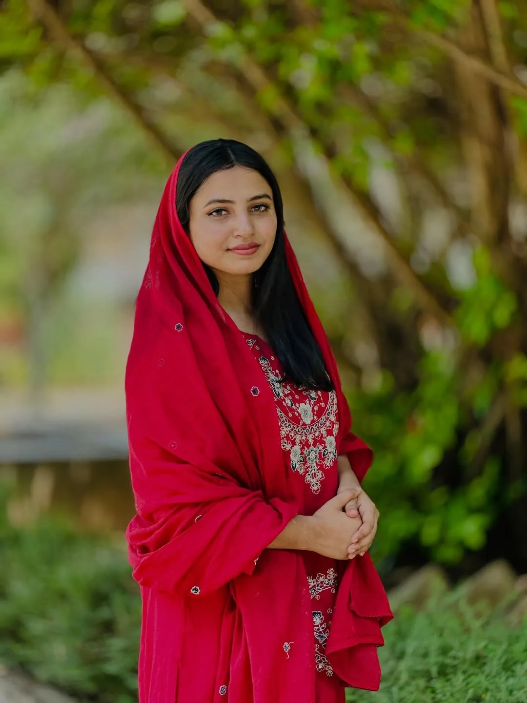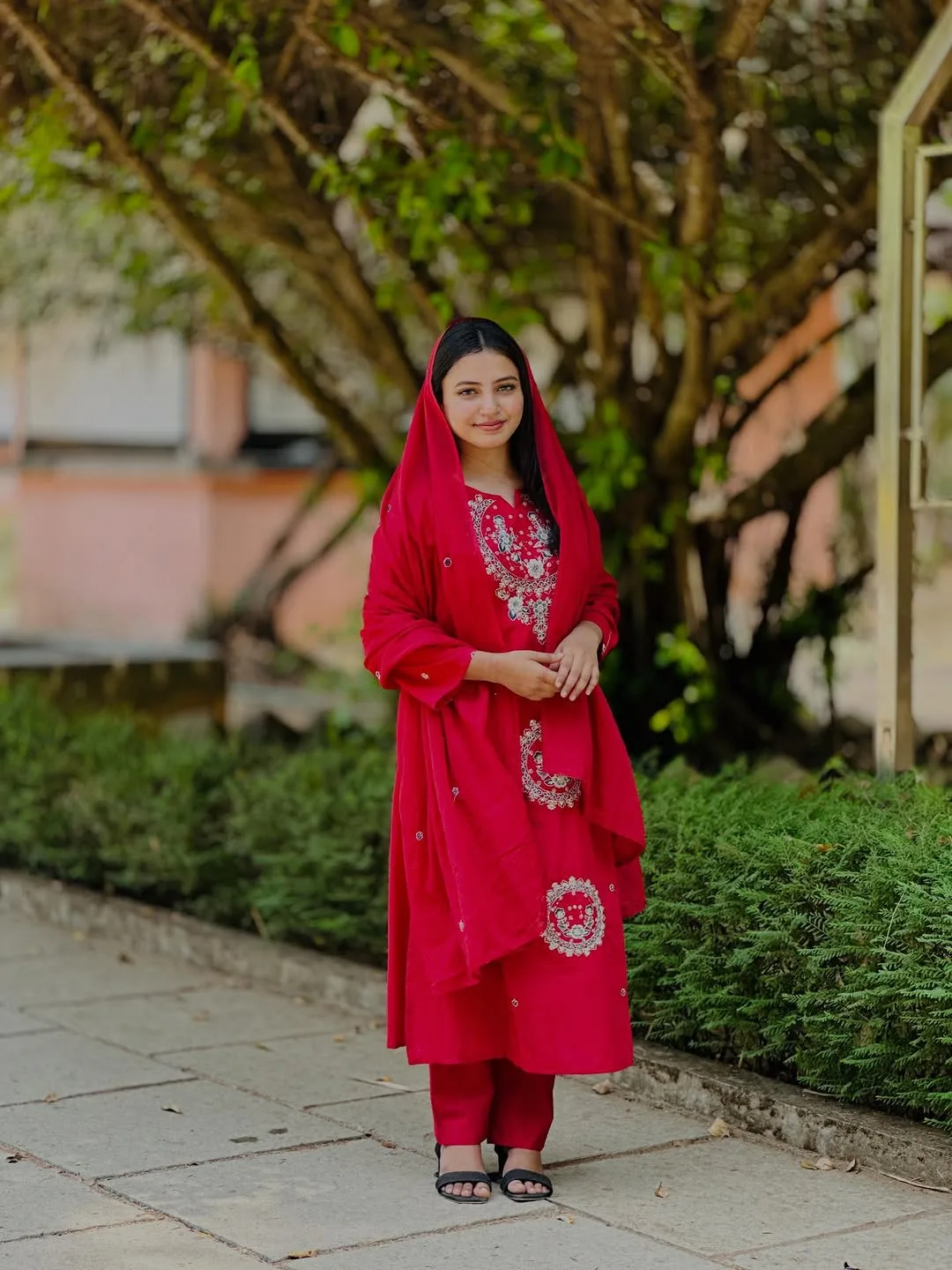 Make a bold statement in this deep crimson ensemble featuring an intricately detailed neckline and delicate floral accents. A sophisticated three-piece set designed for timeless grace at any festive occasion.