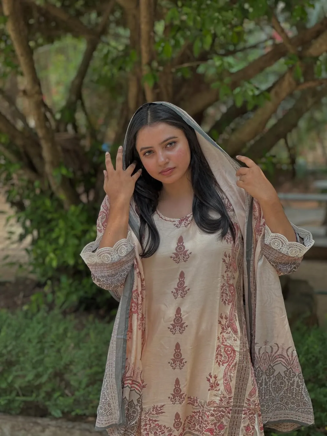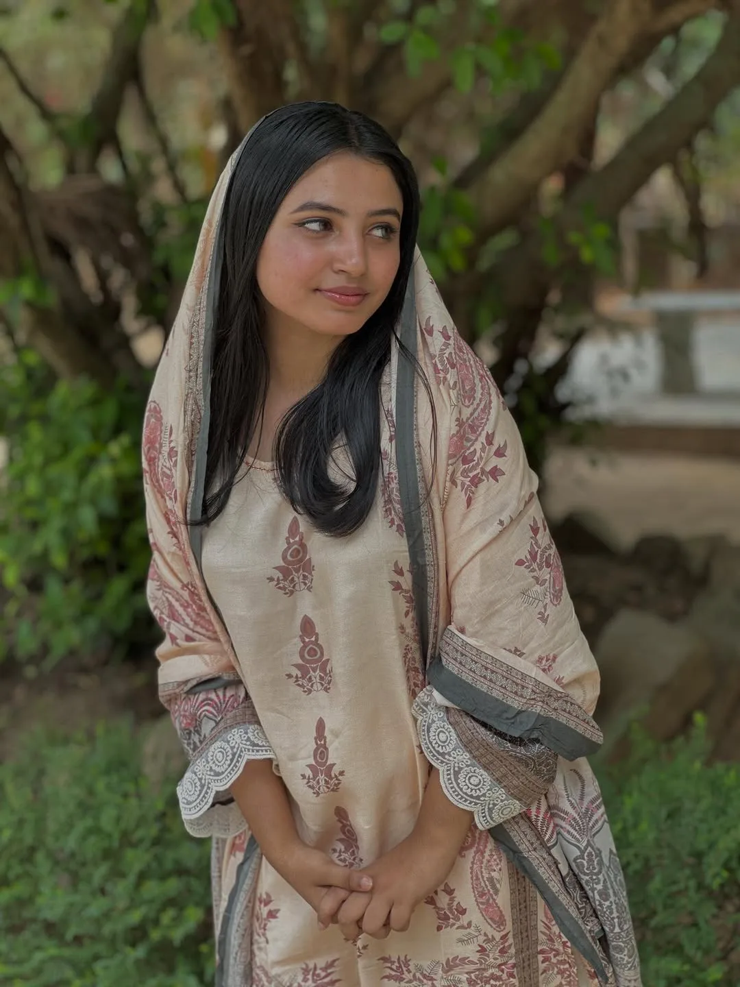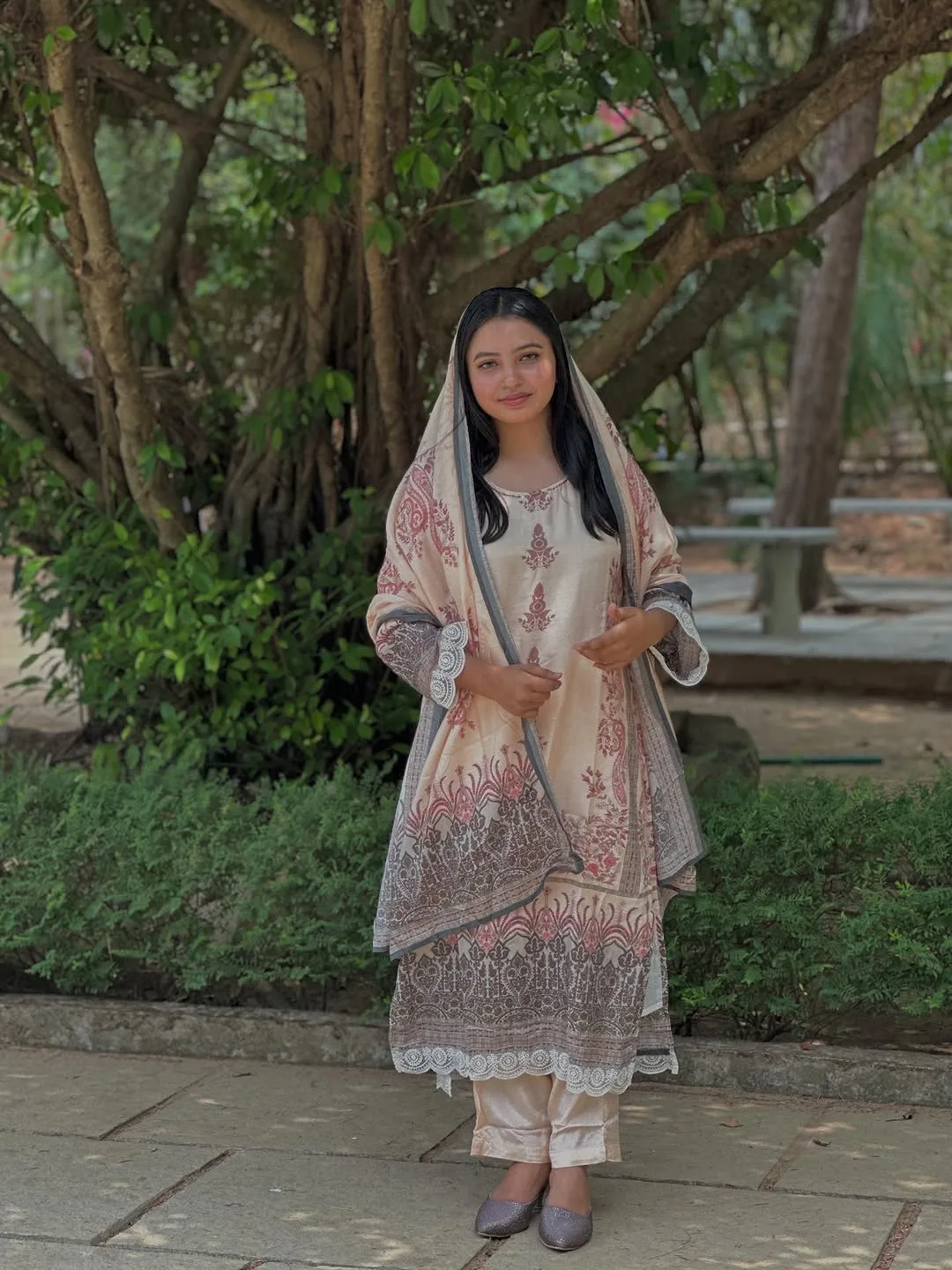 Elevate your ethnic wardrobe with this classic Pakistani-inspired ensemble featuring delicate floral motifs and intricate lace detailing. A perfect blend of heritage style and modern elegance for any festive event.