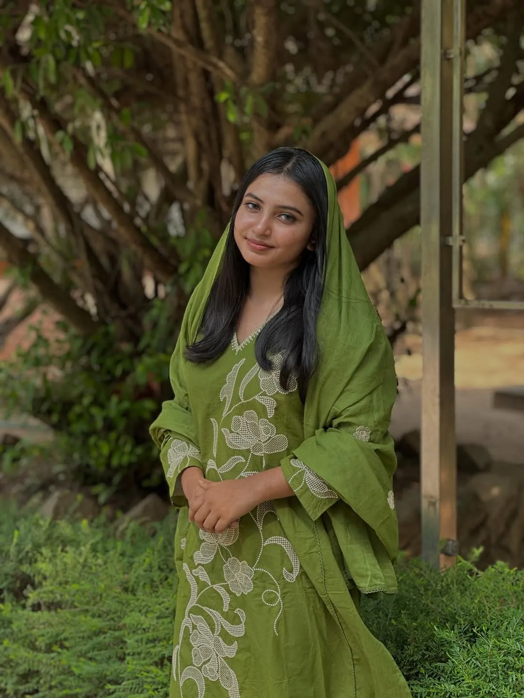 3-piece ethnic set is designed with soft sage green Mul Cotton, featuring intricate cream floral embroidery on the neckline and cuffs