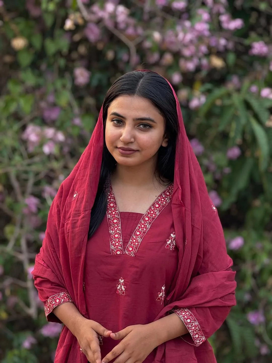 Embrace the perfect harmony of tradition and contemporary grace with our Garnet Petal Set. Drenched in a rich, deep carmine red, this ensemble is designed for the woman who appreciates subtle luxury. The soft, breathable fabric is adorned with delicate floral motifs and intricate needlework along the neckline and cuffs, making it an ideal choice for both festive gatherings and elegant evening wear.