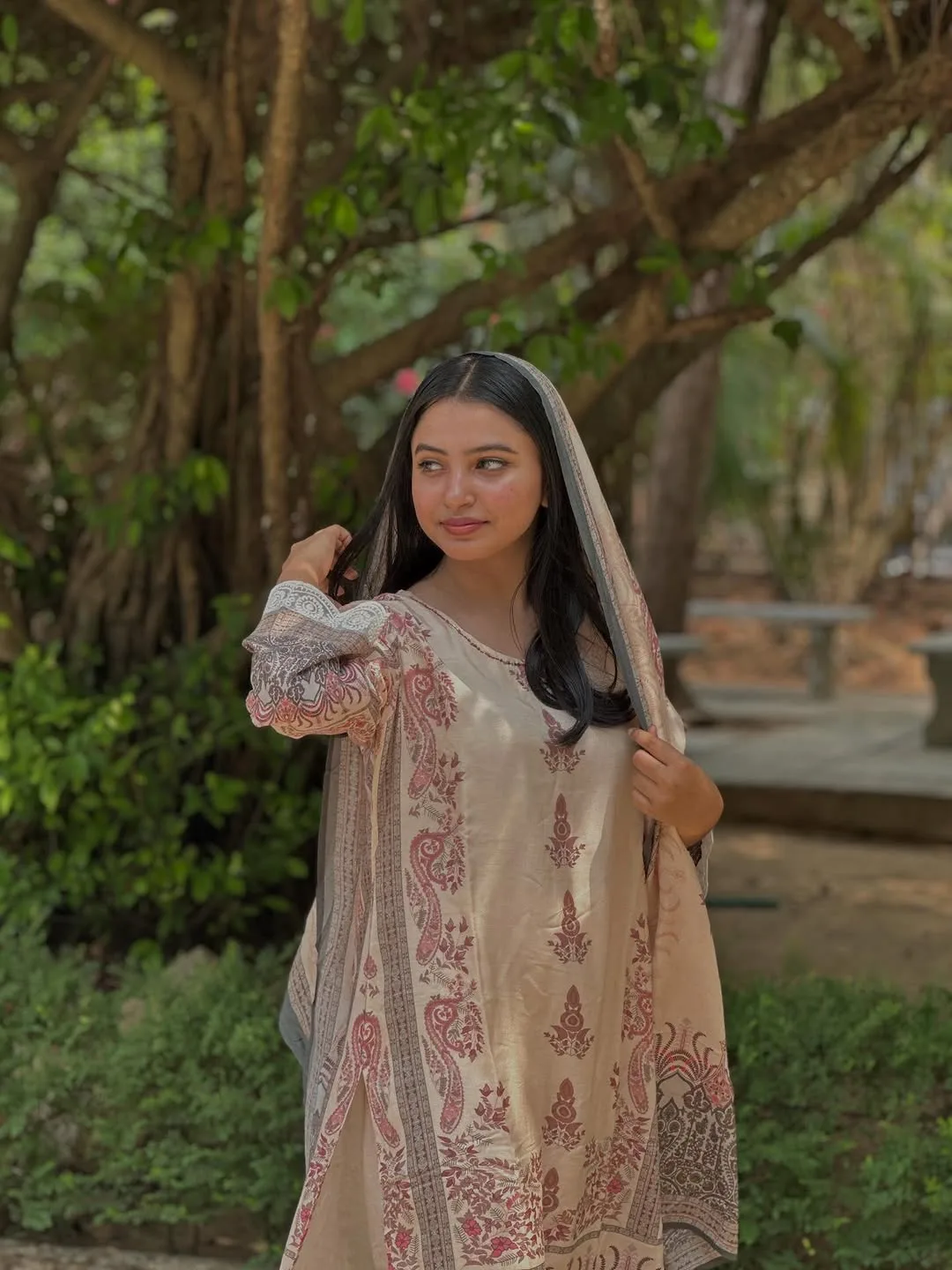 Elevate your ethnic wardrobe with this classic Pakistani-inspired ensemble featuring delicate floral motifs and intricate lace detailing. A perfect blend of heritage style and modern elegance for any festive event.